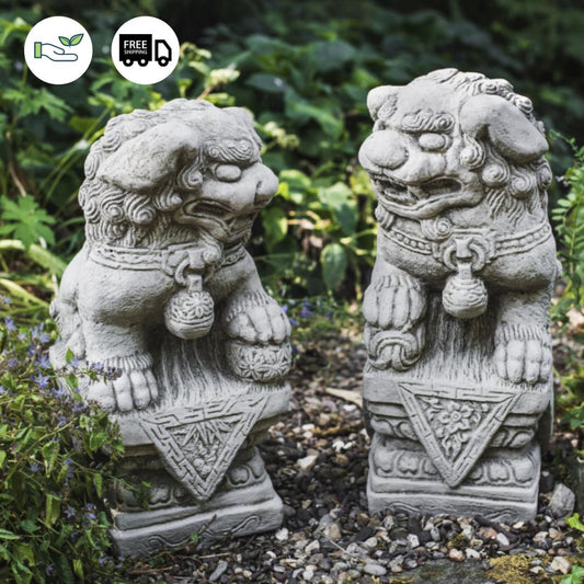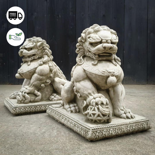 Stone Cast Pair of Chinese Oriental Foo Dogs Outdoor Decor