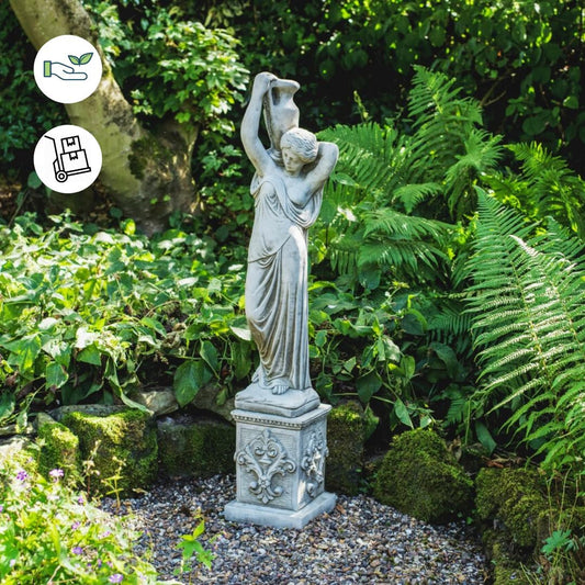 Classic Stone Cast Girl statue with an Urn and Decorative Square Plinth