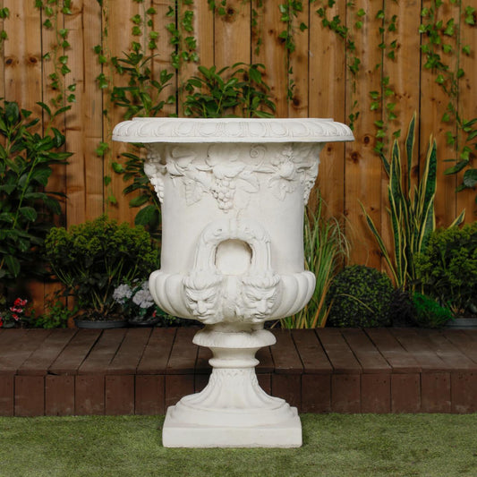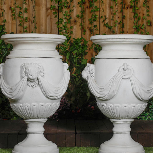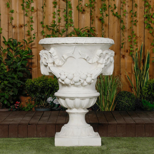 Elegant White Stone Cast Urn with Classical Swag Detailing