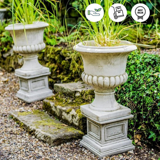 DGS Statues Pair of Large Stone Cast Flute Urns and Classic Plinths