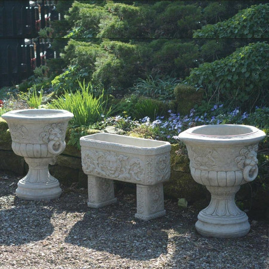 Pair of Lion Head design Stone Vases and Planter Troughs