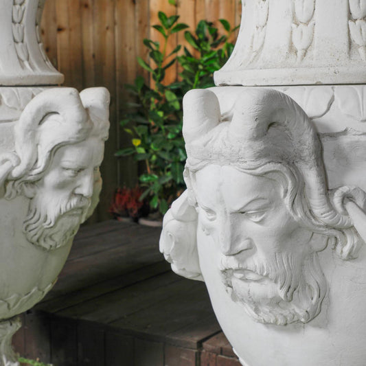 Pair Of Very Large White Stone Cast Lion Head Design Vase Urn