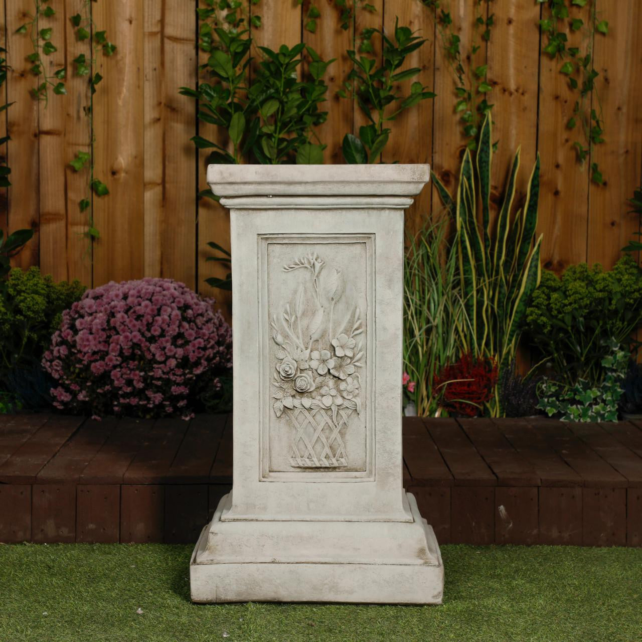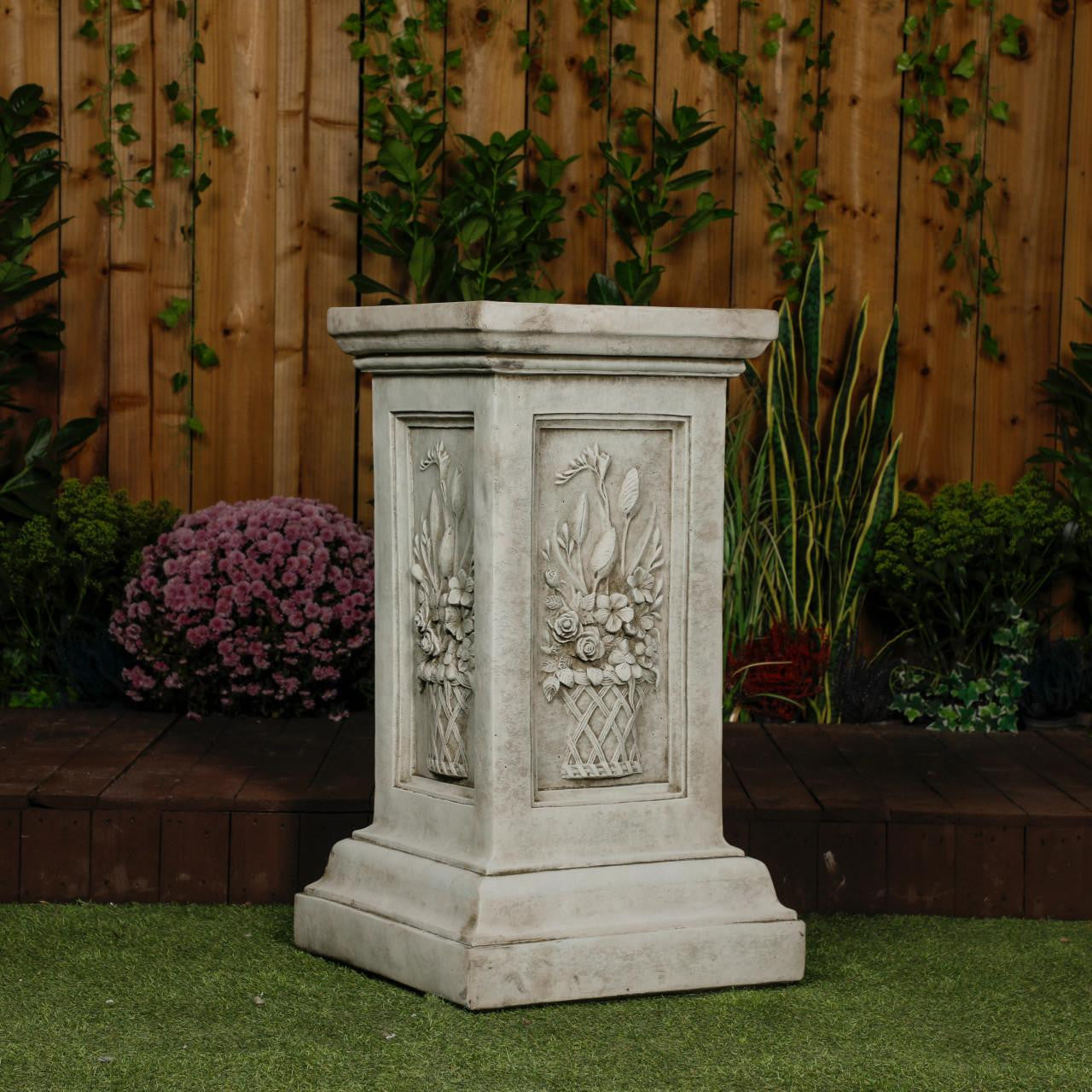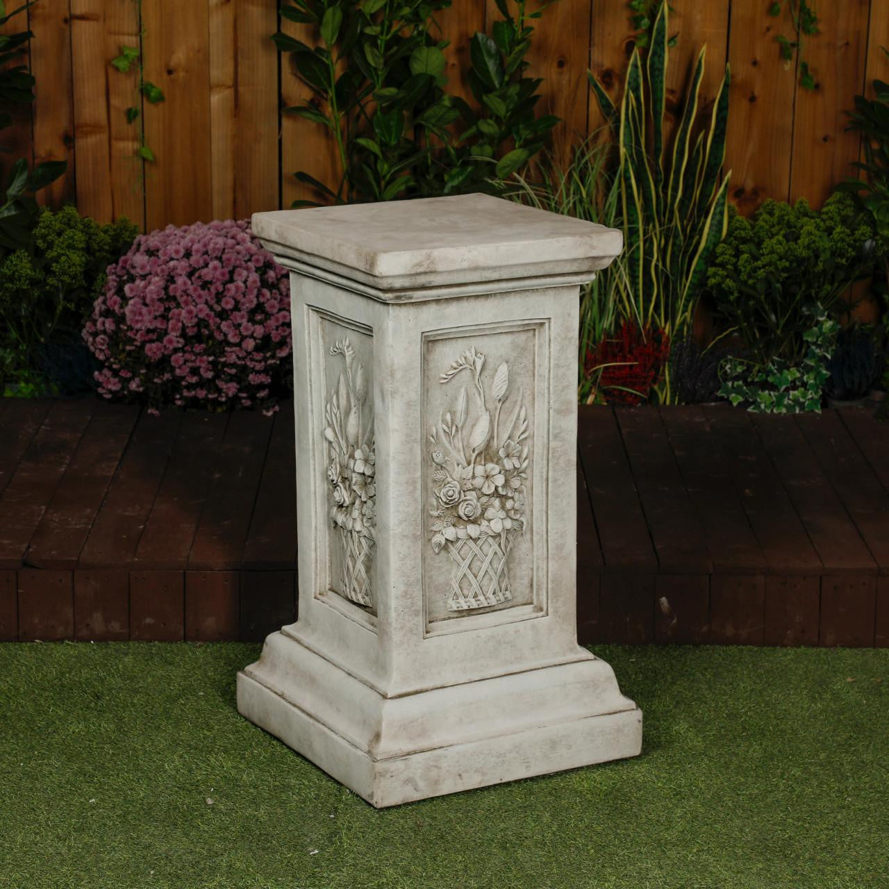 Add timeless charm to your home or garden with this elegant floral plinth. Inspired by classical design, it features a sturdy square base and a delicately detailed shaft that draws the eye upward. Made from durable, weather-resistant materials, it works beautifully as a garden ornament or as a pedestal for planters, sculptures, or lanterns.